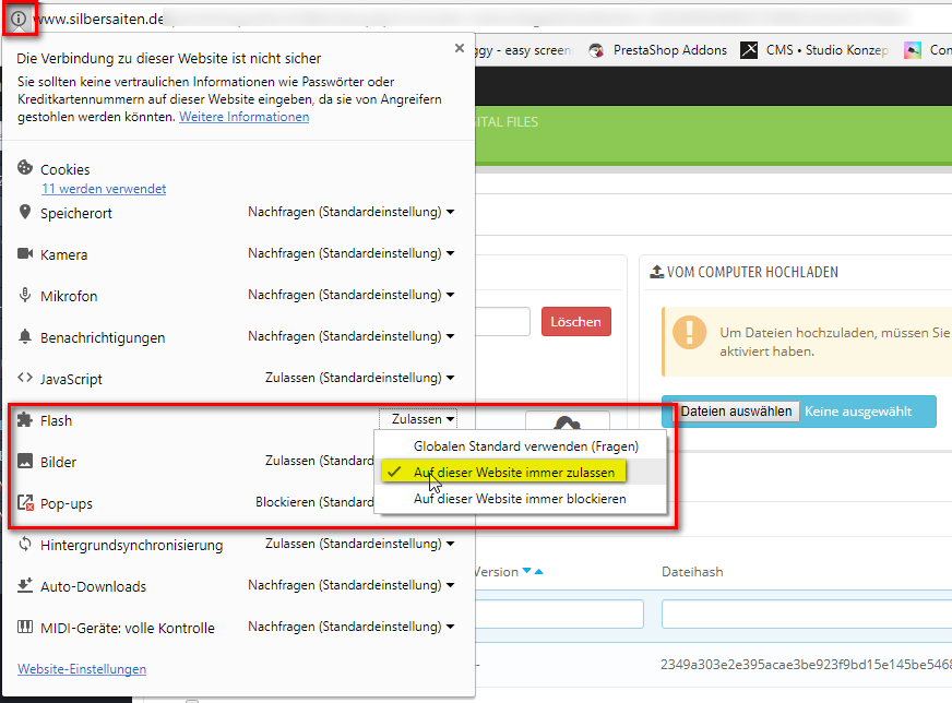 Möglichkeit 1: Klicken Sie auf das i-Symbol neben Ihrer Shop-URL. Sie sehen hier, ob Flash von Ihrem Browser erlaubt wird. Stellen Sie diese Option auf "Auf dieser Website immer zulassen", damit Flash in Ihrem Shop immer aktiviert ist.